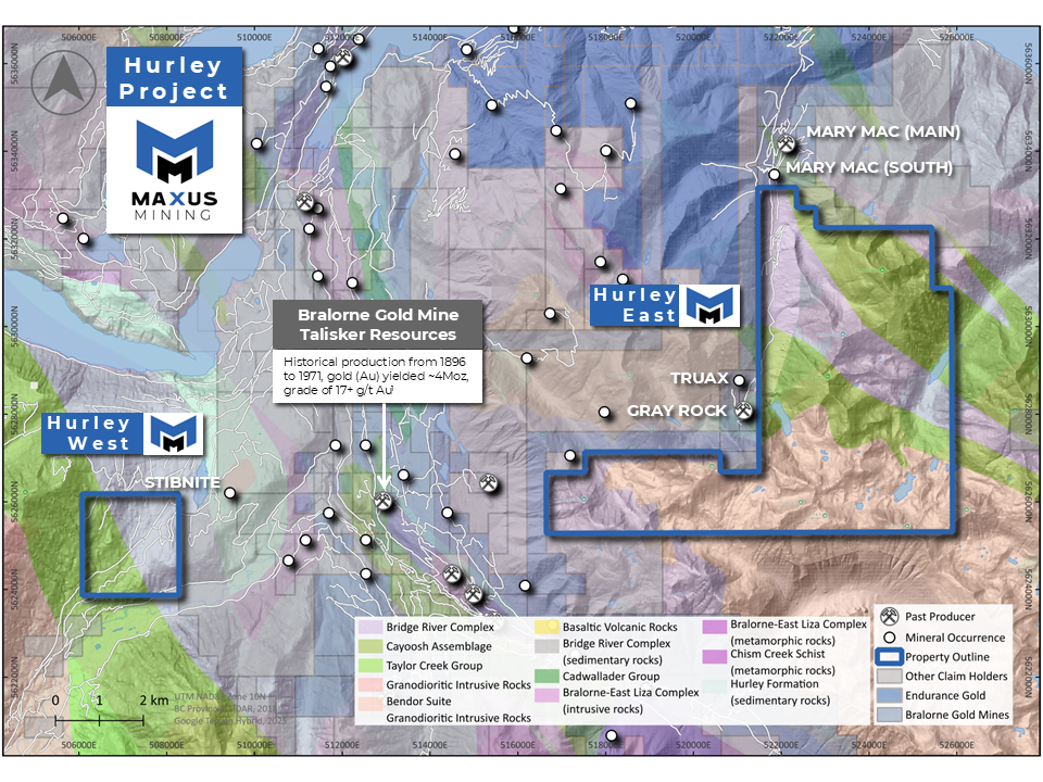Hurley lies immediately south of the Mary Mac Main Zone – a gold-antimony past producer – four tonnes of stibnite/day with grades of 20% Sb over 2.1 meters and reserves of 13.6 to 18.1 thousand tonnes.2