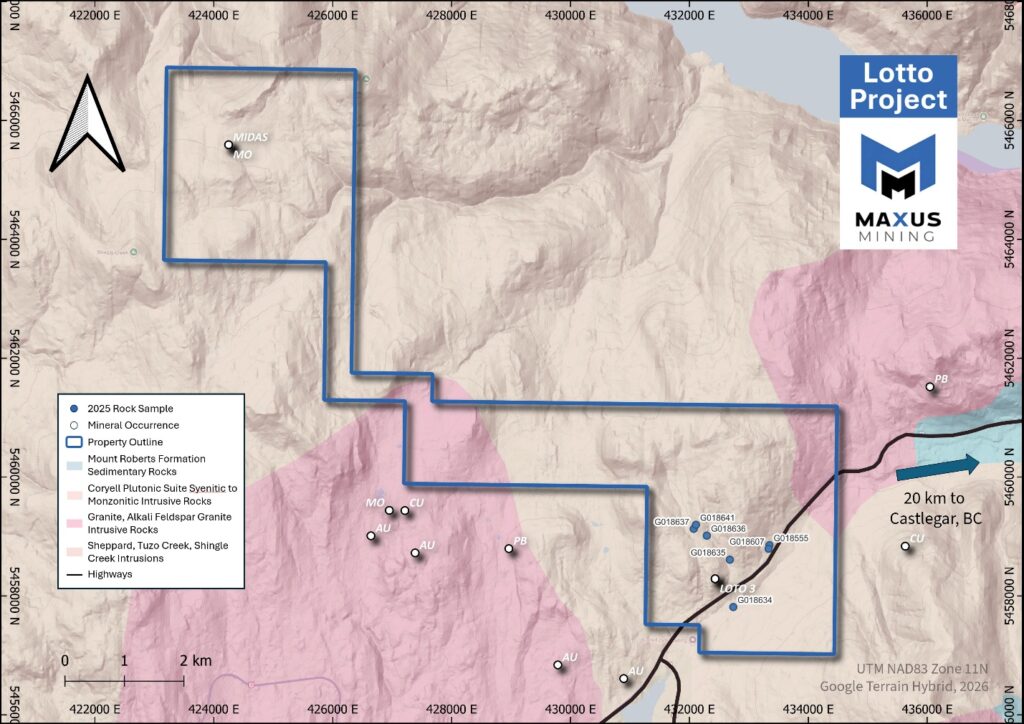 Vancouver, B.C. – Maxus Mining Inc. (“Maxus” or the “Company”) (CSE: MAXM | OTCQB: MXMGF FRA: R7V), is pleased to provide a summary of analytical results from the 2025 field program at its Lotto Tungsten Property (the “Project” or the “Property”), located in the Trail Creek Mining District in British Columbia (Please see Figure 1). Maxus engaged Palliser Exploration Ltd. (“Palliser”) to complete a reconnaissance field program across the Project in autumn 2025 (the “Program”). The first round of results of the 2025 exploration and sampling program at the Project are summarized below (Please see Figure 1).