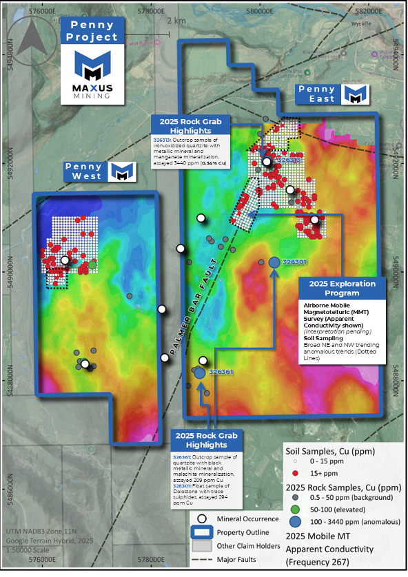 Vancouver, B.C. – Maxus Mining Inc. (“Maxus” or the “Company”) (CSE: MAXM | FRA: R7V), is pleased to announce it has received positive results from the 2025 Exploration Program (the “Program”) at its Penny Copper Project (the “Project” or the “Property”). The Project is strategically located in the Fort Steele Mining Division near the Sullivan Mine in Kimberley, British Columbia.