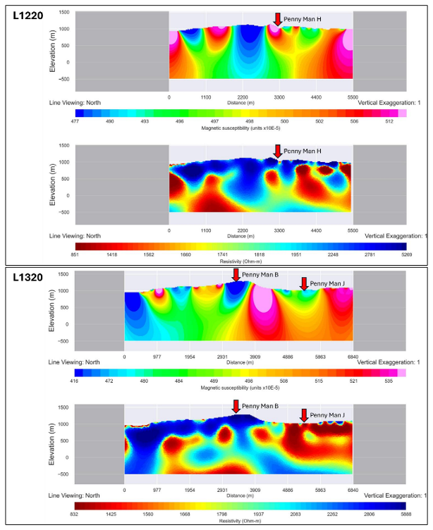Figure 2: Inverted magnetic susceptibility (top) and resistivity (bottom) sections along L1220 (top) and L1320 (bottom) survey lines. Section shown from west to east. Penny Man targets are marked with arrows.