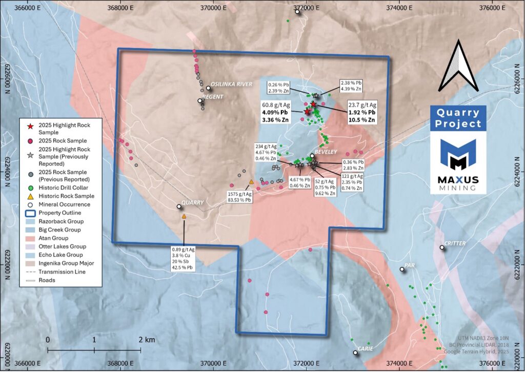 Vancouver, B.C. – Maxus Mining Inc. (“Maxus” or the “Company”) (CSE: MAXM | OTCQB: MXMGF | FRA: R7V) is pleased to provide a summary of analytical results from the 2025 field program at its Quarry Antimony Property (the “Project” or the “Property”), located in the Omineca Mining District in British Columbia (Please see Figure 1). Maxus engaged Palliser Exploration Ltd. (“Palliser”) to complete a reconnaissance field program across the Project in autumn 2025. The second batch of sample results from the 2025 exploration and sampling program (the “Program”)at the Project is summarized below (Please see Figure 2).