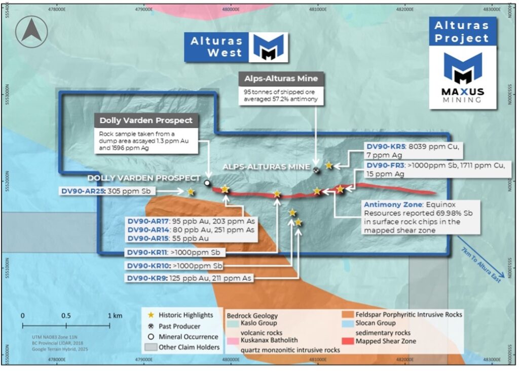 Vancouver, B.C. – Maxus Mining Inc. (“Maxus” or the “Company”) (CSE: MAXM | FRA: R7V), is pleased to provide a summary of exploration highlights on the western block of its flagship Alturas Antimony Project (Please see Figure 1). The Alturas West Block (“Alturas West” or the “Project”) is comprised of 899 hectares of prime critical mineral exploration ground in the Slocan Mining Division in British Columbia (Please see Figure 2)1. The Project hosts the past-producing Alps-Alturas Mine. The Company has completed a comprehensive review of all available historic assessment reports on the Project outlining several historic critical mineral occurrences and prospective antimony exploration potential at Alturas West.
