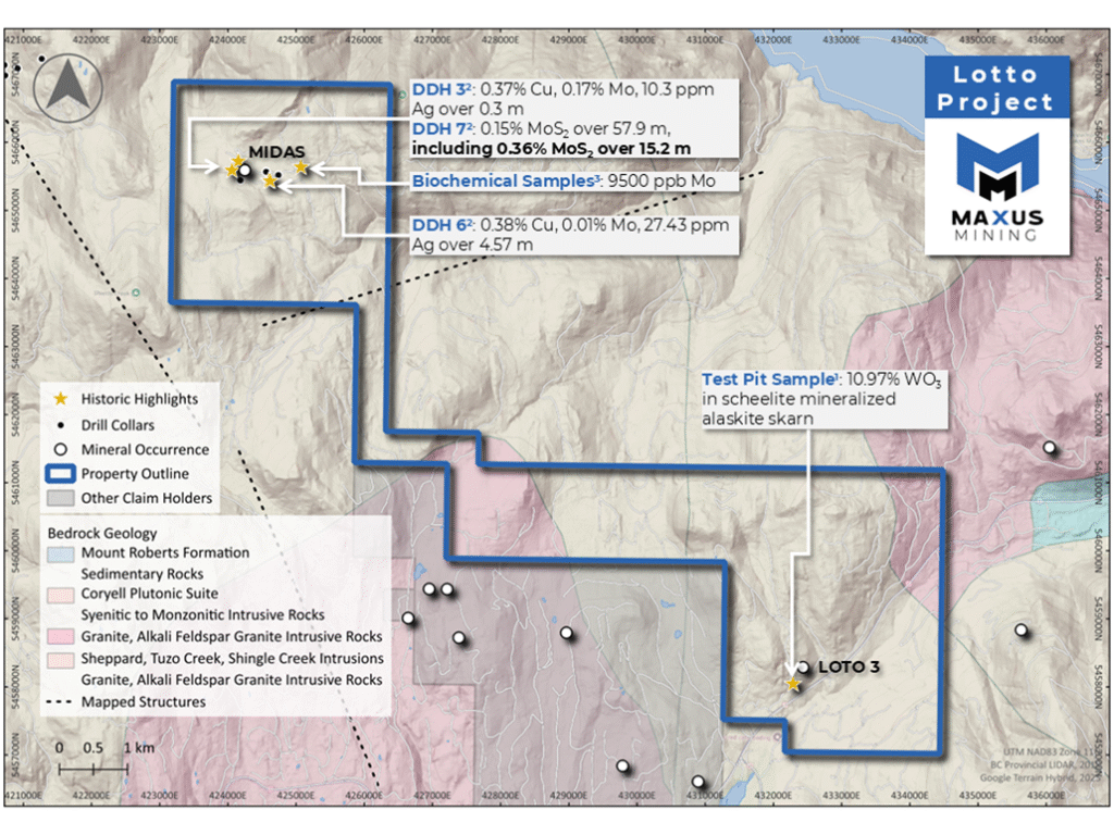 Vancouver, B.C. – Maxus Mining Inc. (“Maxus” or the “Company”) (CSE: MAXM | FRA: R7V), is pleased to provide a summary of exploration highlights at its 3,054-hectare Lotto Project (“Lotto” or the “Project”) in British Columbia (Please see Figure 1). The Company has completed a comprehensive review of more than fifteen (15) historic assessment reports outlining several historic critical mineral occurrences and prospective polymetallic exploration targets for tungsten and other critical metals.