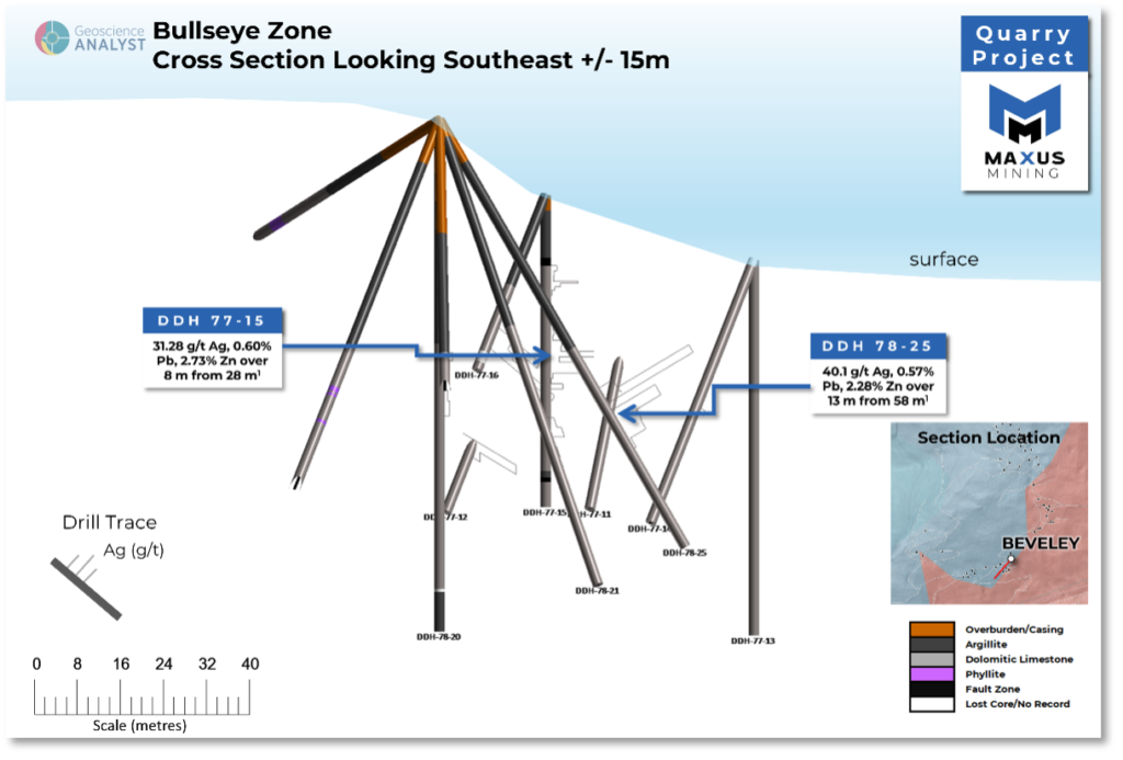 Figure 2: Cross Section of the Bullseye Zone Highlighting Historical Ag-Pb-Zn Mineralization Zones.